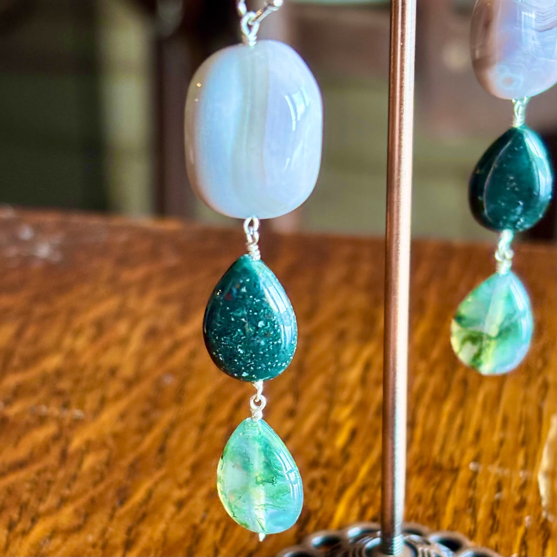 緑色の雫型のビーズはどちらもモスアゲートです。内包物によって異なる印象になります。