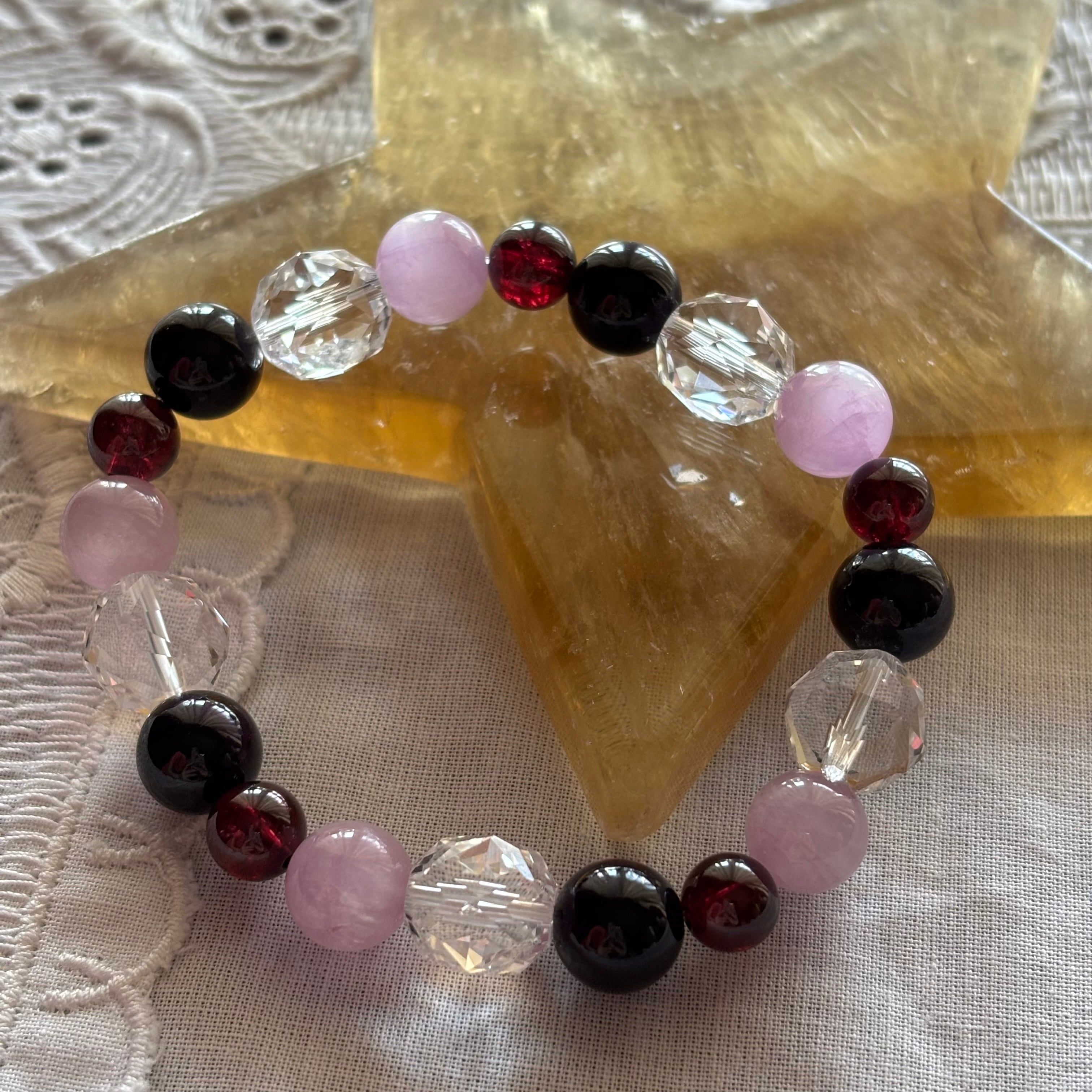 クンツァイト、パープライト、ロードライトガーネット、カットクォーツを組み合わせた、上品で女性らしいブレスレットです。