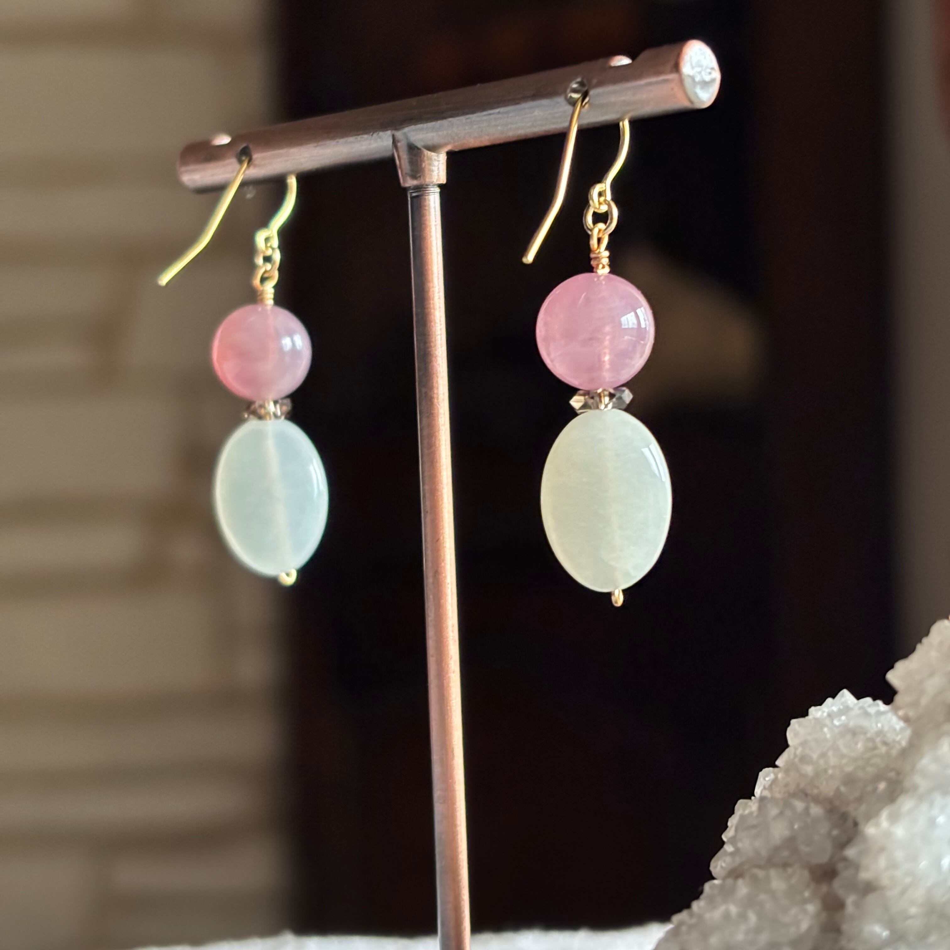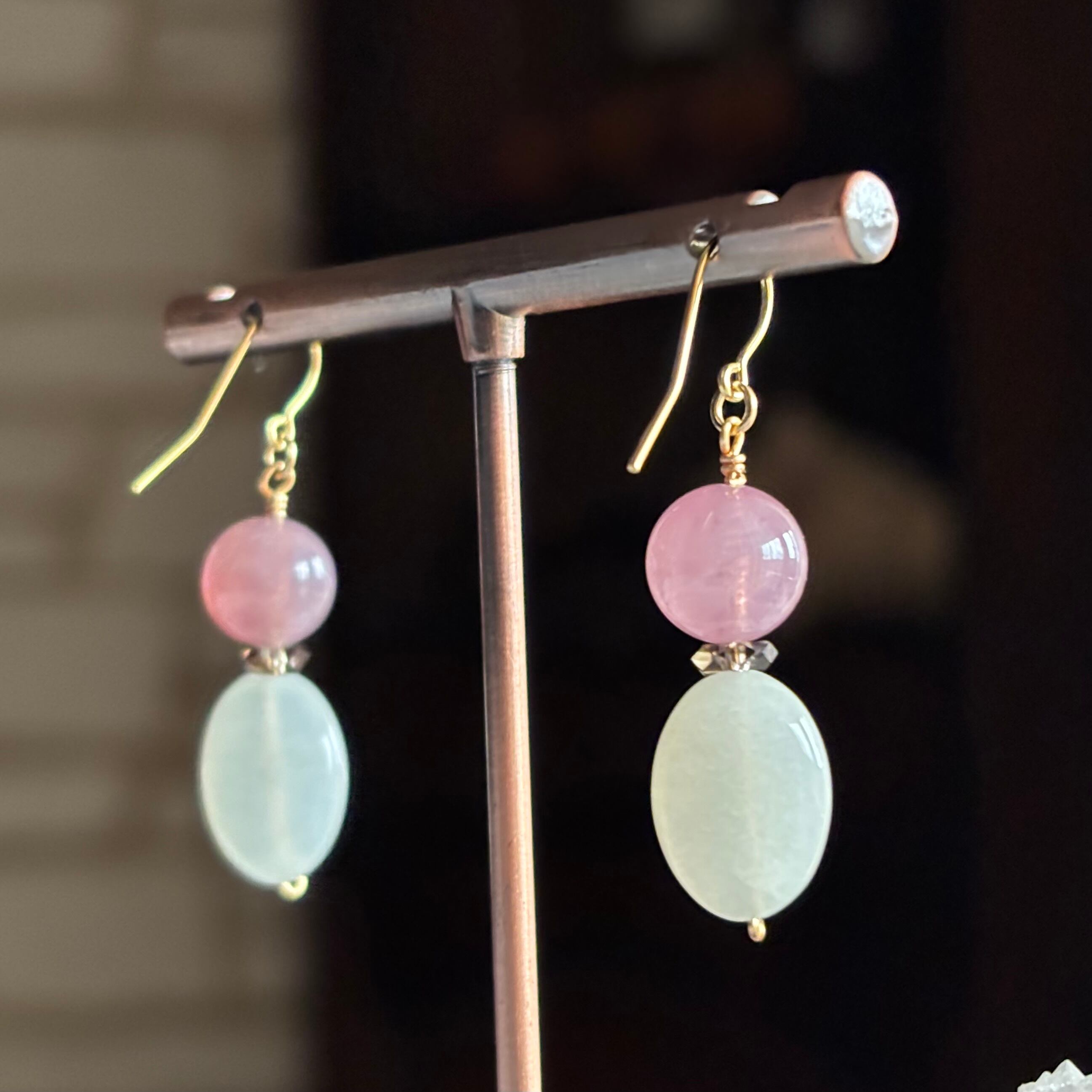 紫がかったパープルローズクォーツと、ムーンストーンのピアスです。間にはスモーキークォーツのきれいなカットビーズをいれました。